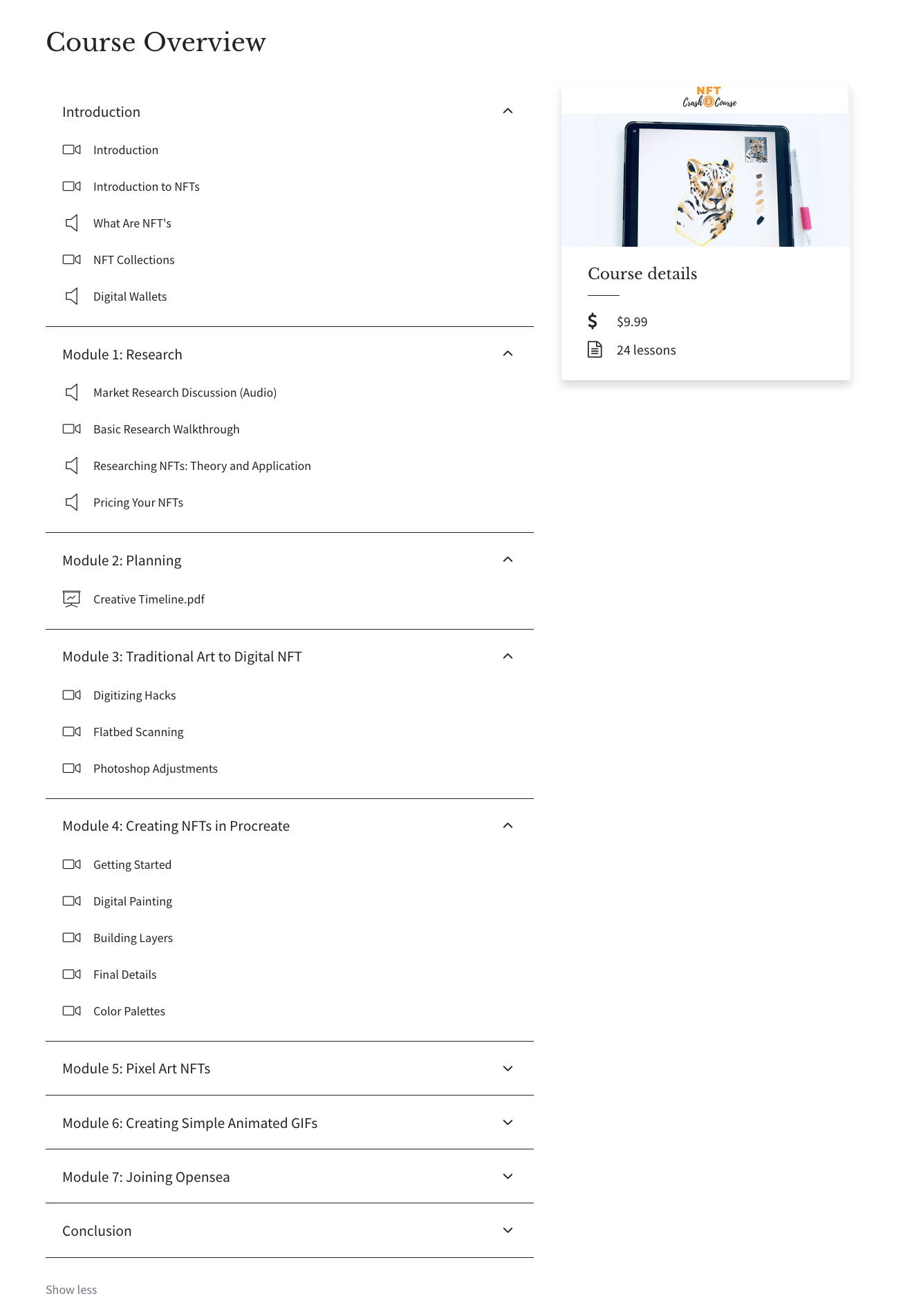 I begin at the very beginner level by showing you how to take your traditional art and make it into an NFT. We cover digital illustration, timelines, planning, and research.